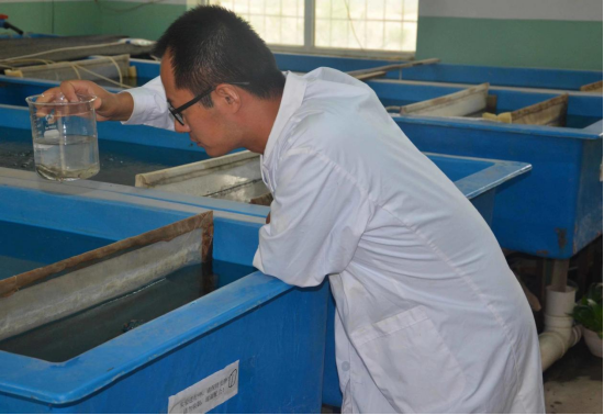 陈生熬教授在塔里木大学实验室查看叶尔羌高原鳅仔二代鱼苗