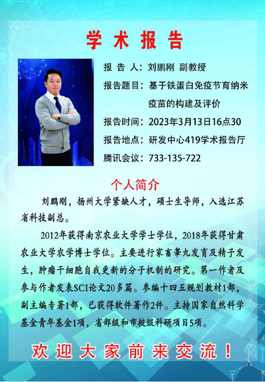“名师进实验室”系列讲座---扬州大学刘鹏刚副教授-基于铁蛋白兔免疫节育纳米疫苗的构建及评价
