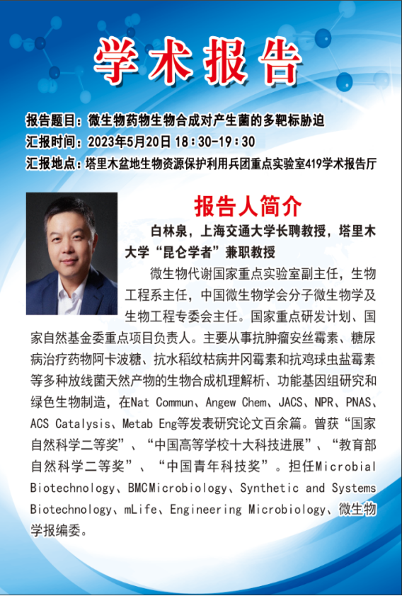 “名师进实验室”系列讲座---上海交通大学白林泉教授-微生物药物生物合成对产生菌的多靶标胁迫