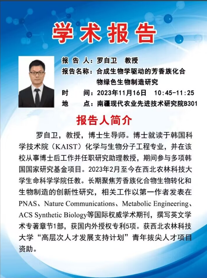 “名师进实验室”系列讲座---西北农林科技大学罗自卫教授-合成生物学驱动的芳香族化合物绿色生物制造研究