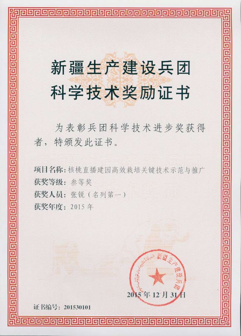 新疆生产建设兵团科学技术进步奖三等奖-核桃直播建园高效栽培关键技术示范与推广