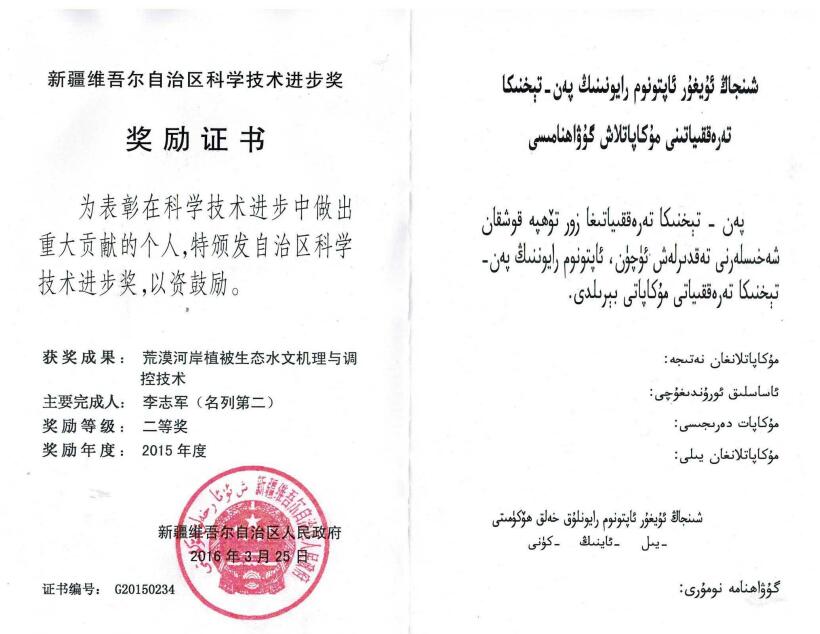 新疆维吾尔自治区科学技术进步奖二等奖-荒漠河岸植被生态水文机理与调控技术
