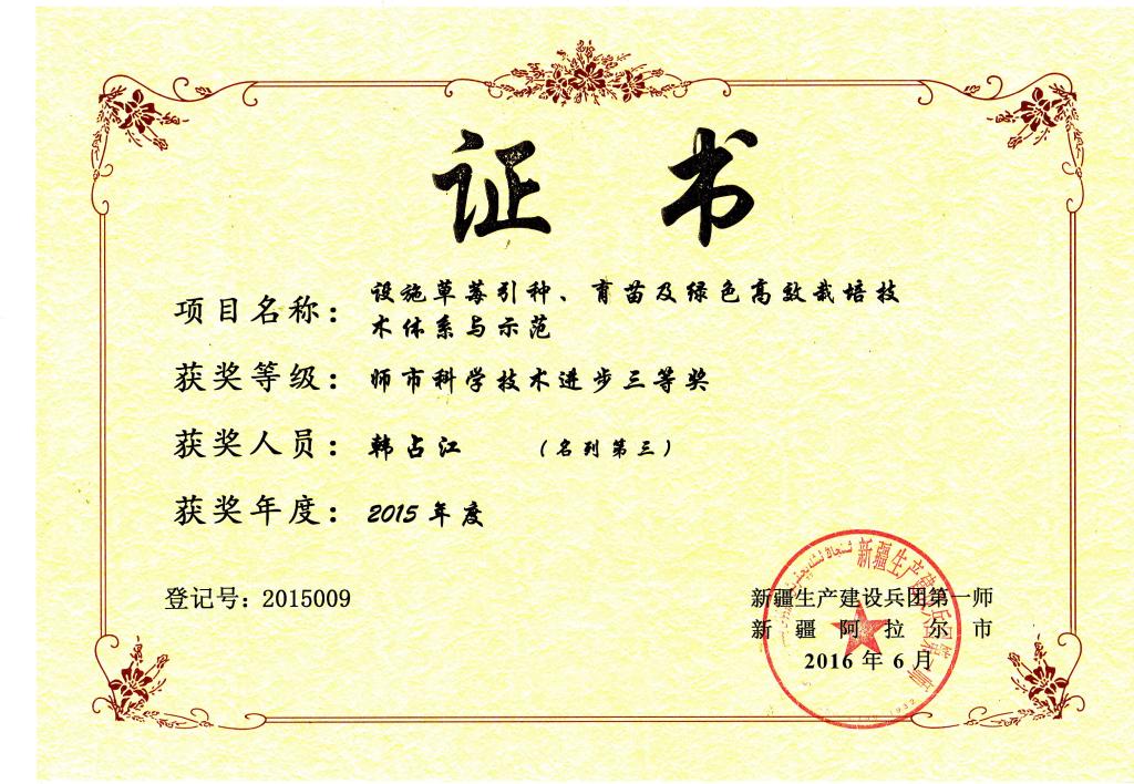 新疆生产建设兵团第一师科学技术进步奖三等奖-设施草莓引种、育苗及绿色高效栽培技术体系及示范