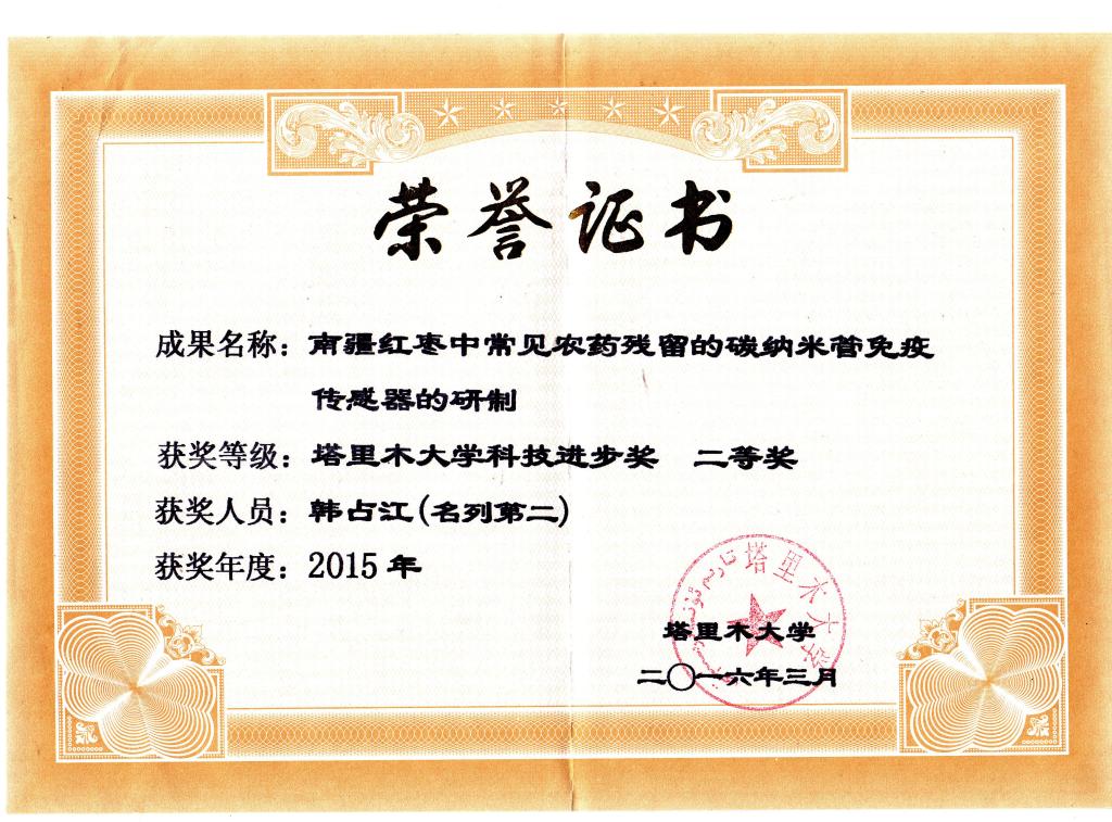 塔里木大学科技进步奖二等奖-南疆红枣中常用农药残留的碳纳米管免疫传感器的研制