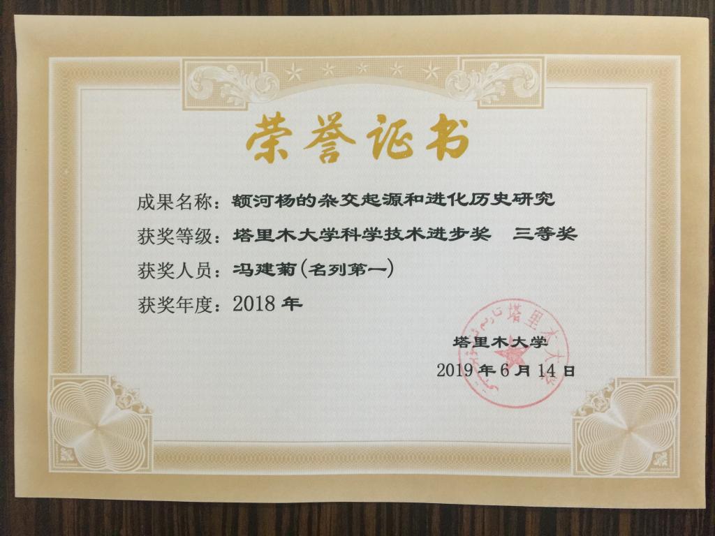塔里木大学科技进步奖三等奖-额河杨的杂交起源和进化历史研究