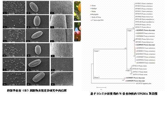 新疆地处欧亚大陆腹地,蕴藏着世界唯一的野生杏和极其丰富的栽培杏资源,是世界栽培杏的起源中心,在世界杏资源的遗传多样性、传播及驯化中起着重要作用。本项目通过对新疆现存的野生杏、栽培杏和“一带一路”的种质资源和品种的收集、评价和保存的基础上,利用DNA条形码和RAD-Seq/SNP库技术阐明新疆栽培杏的驯化历程、归属和重要性状的定向选择,并解析其在世界杏果树中的重要地位;在此基础上解析适应性驯化中,重要性状的定向选择的科学问题。为我国杏种质的保存、利用和新品种培育奠定理论基础和种质储备。基于形态学、孢粉学和分子标记的研究得出紫杏不具有种的分类学地位。