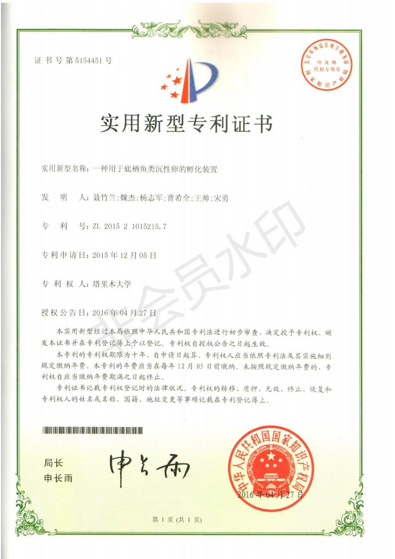 实用新型专利-一种用于底栖鱼类沉性卵的孵化装置