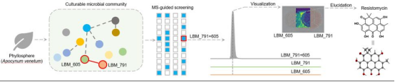 本研究提出了一种利用微生物群内共存菌株间动态相互作用诱导沉默 BGCs表达的通用策略,通过解构/重构二元相互作用建立基因簇激活流程。研究从罗布麻叶际通过连续稀释法获得2760个微生物个体,筛选出44株可培养菌株,其中12.6%的菌株二元组合表现出强烈的相互作用效应(包括抑制和促进作用)。选取4株潜力菌株进行全面代谢检测,发现25.3%的相互作用组合呈现显著代谢组学变化,具有沉默基因簇激活活性。通过质谱成像(IMS)等技术,从链霉菌属菌株LBM_605与红球菌属菌株LBM_791的共培养体系中,成功鉴定出具有杀菌活性的天然产物抗性霉素(resistomycin)。进一步研究证实,抗性霉素的生物合成基因簇源自LBM_605,且该沉默基因簇的激活依赖于与LBM_791的共培养,呈剂量依赖性,物理接触是激活效应的主要影响因素,共培养条件下LBM_605中抗性霉素生物合成基因簇的核心基因remC和remN显著上调表达。